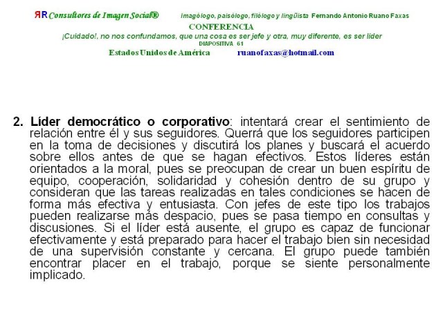 •En donde hay “líderes” se tiende a una estructura tipo orquesta, armónica, con una “filosofía de vuelo de ganso”, de “trabajo en equipo”, de “trabajo colaborativo”: “yo doy el ejemplo, motivo, propongo, pero tú también” y “tú me sigues, pero yo también te puedo seguir, te oigo y reflexiono”.