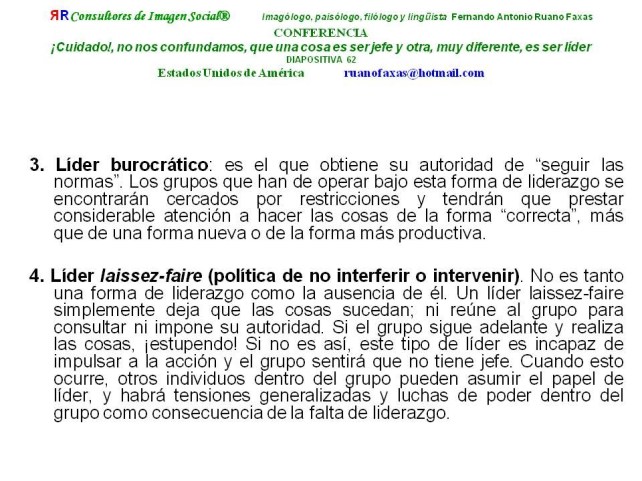 4. Líder laissez-faire (política de no interferir o intervenir). No es tanto una forma de liderazgo como la ausencia de él. Un líder laissez-faire simplemente deja que las cosas sucedan; ni reúne al grupo para consultar ni impone su autoridad. Si el grupo sigue adelante y realiza las cosas, ¡estupendo! Si no es así, este tipo de líder es incapaz de impulsar a la acción y el grupo sentirá que no tiene jefe. Cuando esto ocurre, otros individuos dentro del grupo pueden asumir el papel de líder, y habrá tensiones generalizadas y luchas de poder dentro del grupo como consecuencia de la falta de liderazgo.