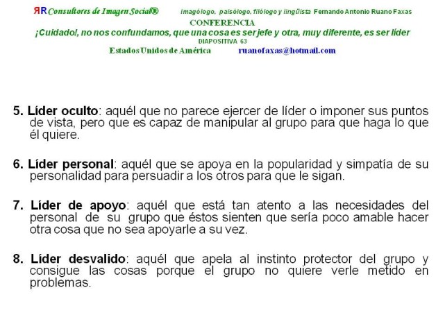 6. Líder personal: aquél que se apoya en la popularidad y simpatía de su personalidad para persuadir a los otros para que le sigan.
