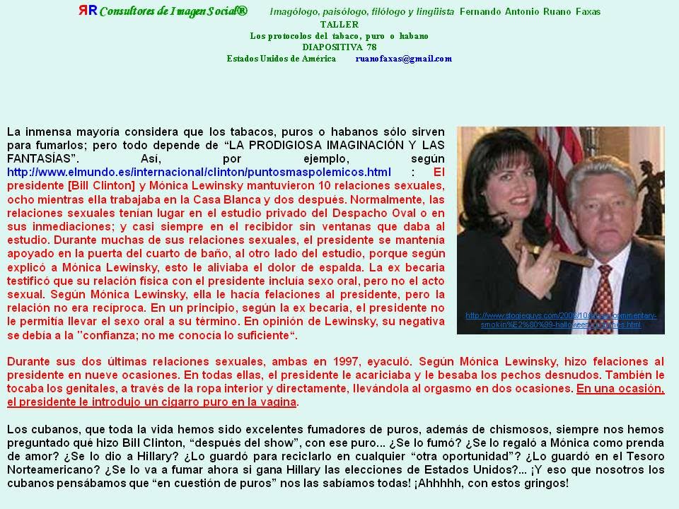 El tabaco no solamente se ha fumado y se fuma; también se ha aspirado, masticado, tomado, comido, untado en el cuerpo, usado como colirio y empleado como lavativa, lavado anal o enema. Éstos han sido los usos que, tradicionalmente, los indígenas de América y los ciudadanos de otros continentes le han dado a los puros. Pero, al parecer, el tabaco o puro también puede ser empleado en otros “actos fantasiosos”, como nos ha mostrado la prodigiosa imaginación sexual del brillante ex-presidente estadounidense Bill Clinton –al respecto puede consultarse la siguiente página en Internet: http://www.yatv.com/video/yatv2_video_n_219894_1.html# […] La inmensa mayoría considera que los tabacos, puros o habanos sólo sirven para fumarlos; pero todo depende de “LA PRODIGIOSA IMAGINACIÓN Y LAS FANTASÍAS”. Así, por ejemplo, según http://www.elmundo.es/internacional/clinton/puntosmaspolemicos.html :