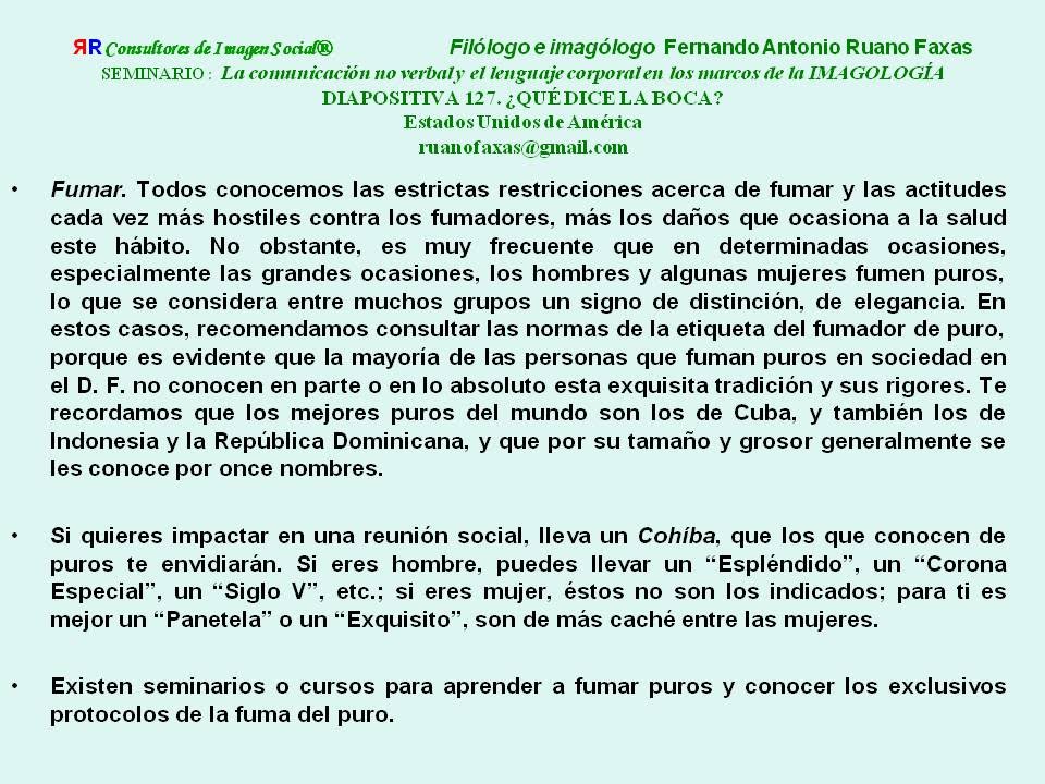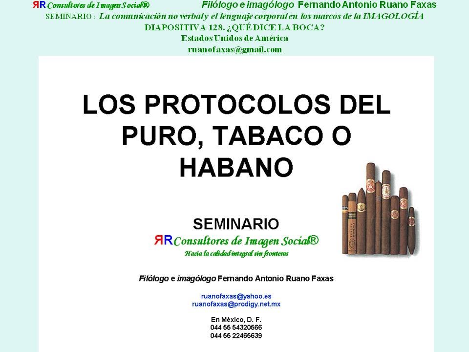 […] Todos conocemos las estrictas restricciones acerca de fumar y las actitudes cada vez más hostiles contra las tabacaleras, los productores de tabacos y cigarros, los fumadores, etc., más los daños que ocasiona este hábito a la salud de los fumadores activos y los fumadores pasivos –incluyendo al feto–: “El consumo del tabaco, planta estimulante de origen americano, está sólidamente arraigado entre los usos y costumbres sociales de muchos países que desconocían sus propiedades hace solamente cuatro siglos” (Martínez, 1988: 46). No obstante, es muy frecuente que en determinadas ocasiones, especialmente las grandes ocasiones, según las esferas sociales y sus tradiciones y protocolos, los hombres y algunas mujeres fumen puros, lo que se considera entre muchos grupos un signo de distinción, de elegancia, de poder, de bonanza y de buena imagen. En estos casos, recomendamos consultar las normas de la etiqueta del fumador de puro, porque es evidente que la mayoría de las personas que fuman puros en sociedad en muchos lugares, y en este caso concreto en el Distrito Federal, no conocen en parte o en lo absoluto esta exquisita tradición y sus rigores. En lo tocante a la etiqueta del fumador de puros, de la misma manera que para cualquier otro fumador de cigarros, es necesario tener en cuenta que no en todos los países y culturas está bien visto o es de buen gusto el encender el cigarrillo o puro al otro o la otra: vecino o invitado, funcionario o nuevo colega, asistente al evento o transeúnte, salvo ciertas circunstancias como cuando un mesero o sirviente se acerca para prender o encender tu cigarro, puro o tabaco. En algunos lugares, esto puede ser visto como una invasión a la privacidad y al espacio personal, como una violación al protocolo personal del acto de fumar, puede ser visto como una ofensa o un desconocimiento del acto de fumar, especialmente si lo que se va a fumar es un puro y más concretamente un excelente puro. De aquí que recomendemos que tanto funcionarios como ejecutivos, que constantemente están en estrecha relación con otros grupos culturales, con otros grupos sociales, se asesoren de manera correcta al respecto de los protocolos del puro, y tomando en cuenta también que el tabaco se cultiva en muchos países, en más de 125 países, entre los cuales los mayores productores son China, India, Brasil, Estados Unidos, Turquía, Argentina… (Mackay y Eriksen, 2002).
