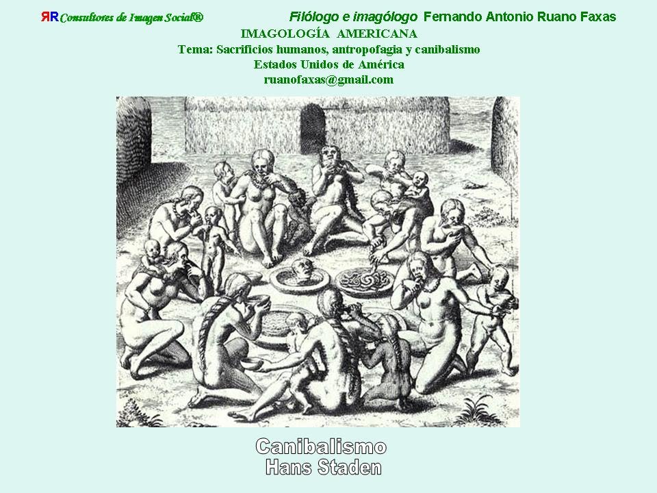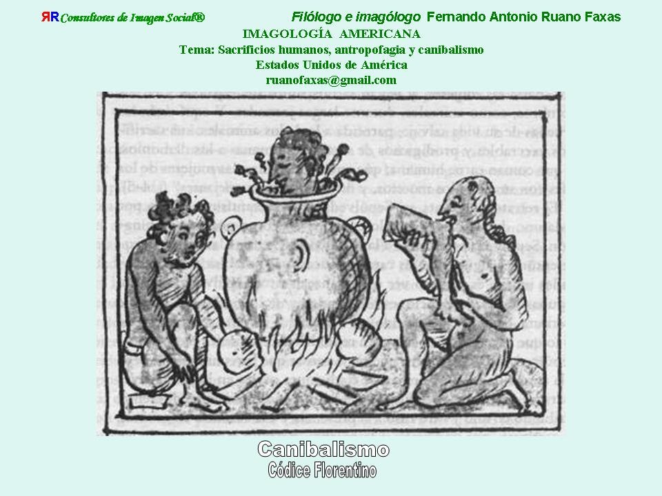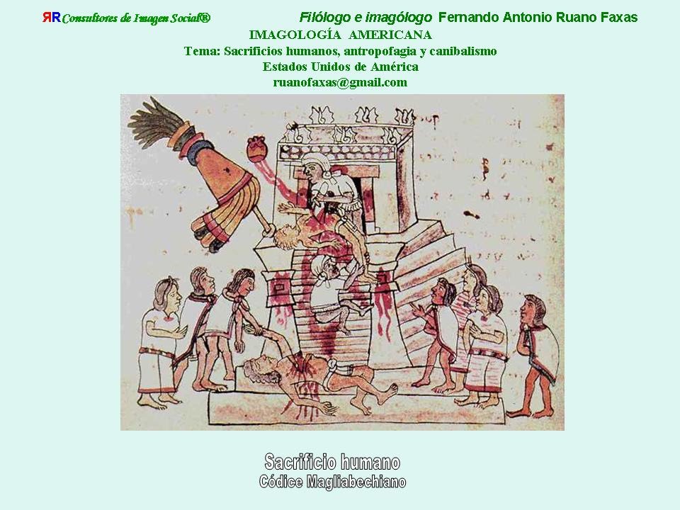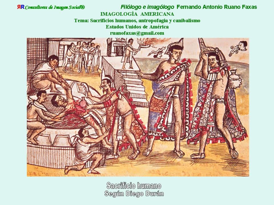 IMAGOLOGÍA AMERICANA: LOS SACRIFICIOS HUMANOS, LA ANTROPOFAGIA Y EL CANIBALISMO, es parte de mi libro registrado con los siguientes datos: Fernando Antonio Ruano Faxas. Algunos recursos para valorar la comunicación a través del lenguaje oral, del lenguaje escrito y del lenguaje corporal: El área geográfica y los climas, Esferas socioculturales, Los estilos, La edad, El sexo, El tabú y la Comunicación no verbal, con 604 páginas, disponible a través de http://openlibrary.org/b/OL22647223M/Algunos_recursos_para_valorar_la_comunicaci%C3%B3n_a_trav%C3%A9s_del_lenguaje_oral__del_lenguaje_escrito_y_del_lenguaje_corporal__El_%C3%A1rea_geogr%C3%A1fica_y_los_climas__Esferas_socioculturales__Los_estilos__La_edad__El_sexo__El_tab%C3%BA_y_la_Comunicaci%C3%B3n_no_verbal .