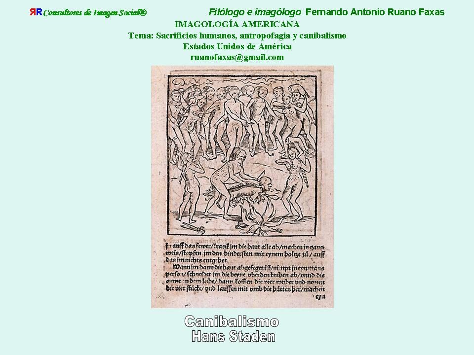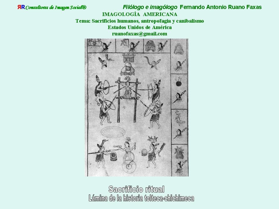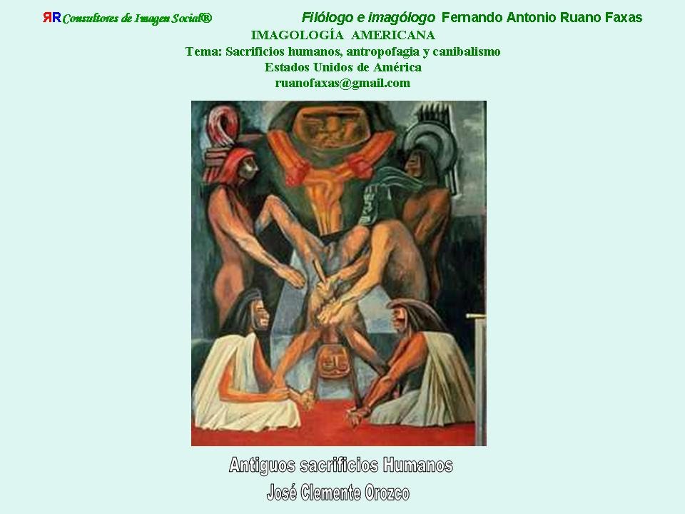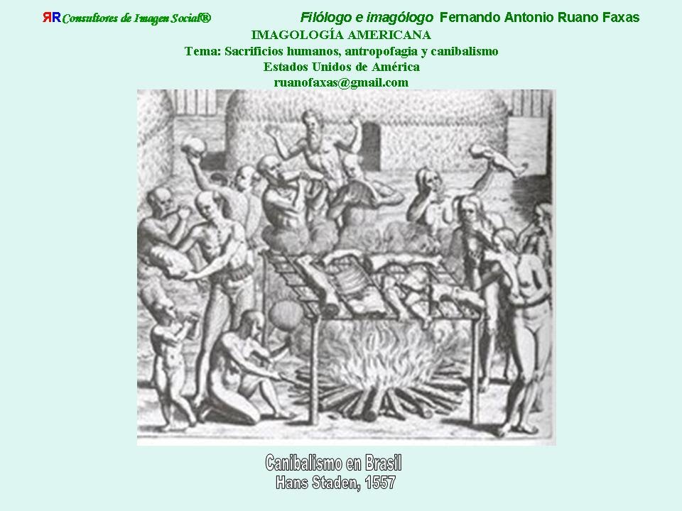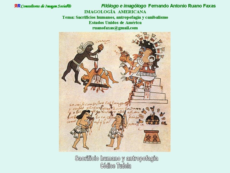 IMAGOLOGÍA AMERICANA: LOS SACRIFICIOS HUMANOS, LA ANTROPOFAGIA Y EL CANIBALISMO, es parte de mi libro registrado con los siguientes datos: Fernando Antonio Ruano Faxas. Algunos recursos para valorar la comunicación a través del lenguaje oral, del lenguaje escrito y del lenguaje corporal: El área geográfica y los climas, Esferas socioculturales, Los estilos, La edad, El sexo, El tabú y la Comunicación no verbal, con 604 páginas, disponible a través de http://openlibrary.org/b/OL22647223M/Algunos_recursos_para_valorar_la_comunicaci%C3%B3n_a_trav%C3%A9s_del_lenguaje_oral__del_lenguaje_escrito_y_del_lenguaje_corporal__El_%C3%A1rea_geogr%C3%A1fica_y_los_climas__Esferas_socioculturales__Los_estilos__La_edad__El_sexo__El_tab%C3%BA_y_la_Comunicaci%C3%B3n_no_verbal .