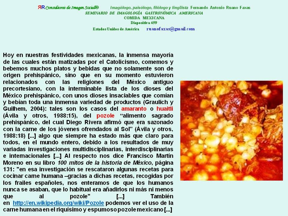 […] Hoy en nuestras festividades mexicanas, la inmensa mayoría de las cuales están matizadas por el Catolicismo, comemos y bebemos muchos platos y bebidas que no solamente son de origen prehispánico, sino que en su momento estuvieron relacionados con las religiones del México antiguo precortesiano, con la interminable lista de los dioses del México prehispánico,[9] con unos dioses insaciables que comían y bebían toda una inmensa variedad de productos (Graulich y Guilhem, 2004): tales son los casos del amaranto o huaitli (Ávila y otros, 1988:15), del pozole “alimento sagrado prehispánico, del cual Diego Rivera afirmó que era sazonado con la carne de los jóvenes ofrendados al Sol” (Ávila y otros, 1988:18) […] algo que siempre ha estado más que claro para todos, en el mundo entero, debido a los resultados de muy variadas investigaciones multidisciplinarias, interdisciplinarias e internacionales […] e inclusive fray Bernardino de Sahagún, en su HISTORIA GENERAL DE LAS COSAS DE LA NUEVA ESPAÑA, en el capítulo 21, dice lo siguiente: ”Después de desollados, los viejos, llamados cuacuacuilti, llevavan los cuerpos al calpulco, adonde el dueño del captivo havía hecho su voto o prometimiento; allí le dividían y embiavan a Motecuçoma un muslo para que comiese, y lo demás lo repartían por los otros principales o parientes; ívanlo a comer a la casa del que captivó al muerto. Cocían aquella carne con maíz, y davan a cada uno un pedaço de aquella carne en una escudilla o caxete, con su caldo y su maíz cocida. Y llamavan aquella comida tlacatlaolli; después de haver comido andava la borrachería” […] Al respecto también nos dice Francisco Martín Moreno en su libro 100 mitos de la historia de México, página 131: “en esa investigación se rescataron algunas recetas para cocinar carne humana –gracias a dichas recetas, recogidas por los frailes españoles, nos enteramos de que los humanos nunca se asaban, que lo habitual era añadirlos ni más ni menos que al pozole” […] También en http://en.wikipedia.org/wiki/Pozole podemos ver el uso de la carne humana en el riquísimo y espumoso pozole mexicano en los tiempos anteriores a la Conquista […]