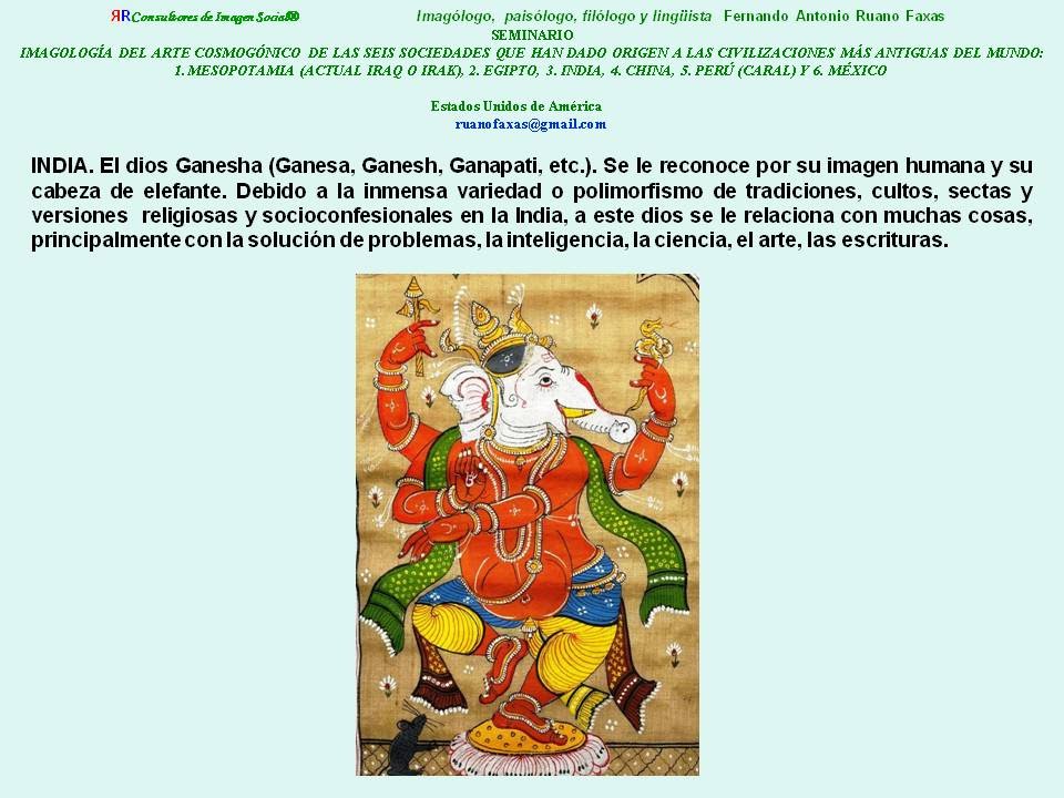 INDIA. El dios Ganesha (Ganesa, Ganesh, Ganapati, etc.). Se le reconoce por su imagen humana y su cabeza de elefante. Debido a la inmensa variedad o polimorfismo de tradiciones, cultos, sectas y versiones religiosas y socioconfesionales en la India, a este dios se le relaciona con muchas cosas, principalmente con la solución de problemas, la inteligencia, la ciencia, el arte, las escrituras.