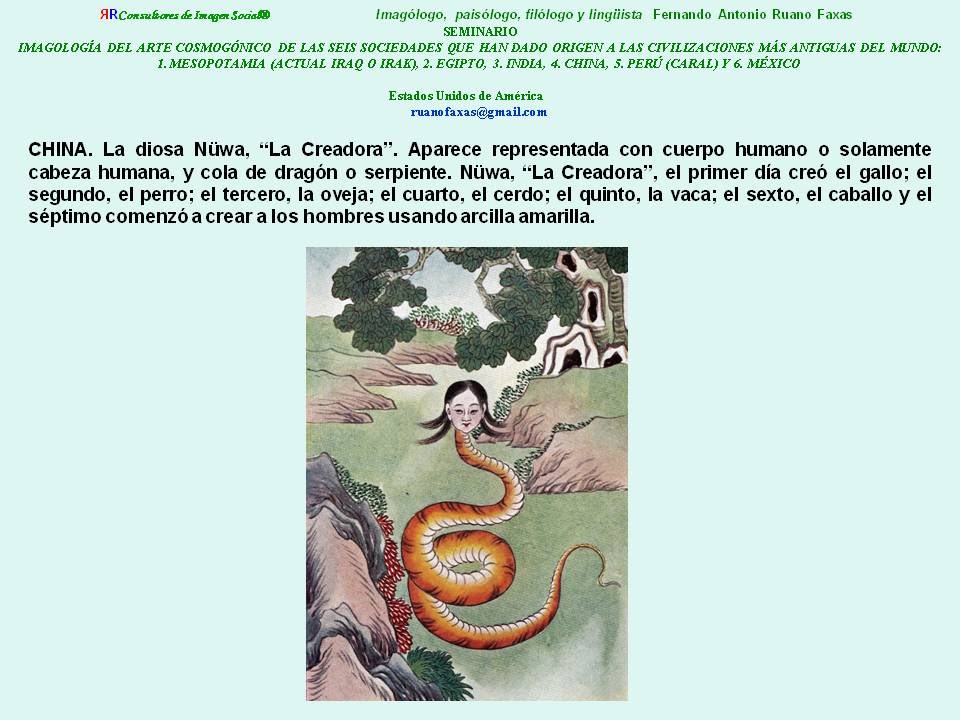 CHINA. La diosa Nüwa, “La Creadora”. Aparece representada con cuerpo humano o solamente cabeza humana, y cola de dragón o serpiente. Nüwa, “La Creadora”, el primer día creó el gallo; el segundo, el perro; el tercero, la oveja; el cuarto, el cerdo; el quinto, la vaca; el sexto, el caballo y el séptimo comenzó a crear a los hombres usando arcilla amarilla.