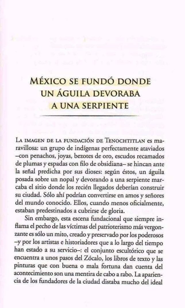 […] “el águila que aún adorna nuestra bandera probablemente nunca existió […] No hubo ningún águila devorando a ninguna serpiente [y los aztecas, en comparación con los otros grupos humanos de la región en aquellos momentos de “la fundación”] eran los más pobres y bárbaros” […] (Francisco Martín Moreno. 100 mitos de la historia de México, 29-33)