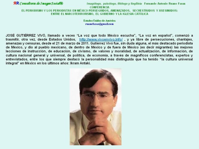 […] José Gutiérrez Vivó, llamado a veces “La voz que todo México escucha”, “La voz en español”, comenzó a trasmitir, otra vez, desde Estados Unidos, y ya libre de persecuciones, chantajes, amenazas y censuras en México, desde el 21 de marzo de 2011. Gutiérrez Vivó fue, sin duda alguna, el más destacado periodista de México, y dio al pueblo mexicano, de dentro de México y de fuera de México (es decir migrantes) las mejores lecciones de instrucción, de educación, de valores y moralidad, de civismo, de actualización, de información, de cultura nacional general y universal, de política, de economía, a través de magníficos conferencistas, expertos y entrevistados, entre los que siempre destacó la personalidad más distinguida que ha tenido “la cultura universal integral” en México en los últimos años: Ikram Antaki. Todos sabemos perfectamente que José Gutiérrez Vivó cayó en desgracia en México porque el gobierno, dirigido por el analfabeto funcional: http://knol.google.com/k/fernando-antonio-ruano-faxas/analfabetismo-funcional-analfabetismo/19j6x763f3uf8/6# […] y ”disfuncional mental” de Vicente Fox: http://knol.google.com/k/un-vistazo-muy-por-arriba-y-desde-el-lado-gabacho-o-gringo-al-gobierno-del# y su mujer, la pueblerina rústica y “amiguita de lo ajeno” (eso es lo que dice la mayoría de los mexicanos en absolutamente todos los medios masivos de comunicación y en las redes sociales) de Martha Sahagún: http://knol.google.com/k/fernando-antonio-ruano-faxas/a-qu%C3%A9-se-le-llama-primera-dama-y-primer/19j6x763f3uf8/26# […]