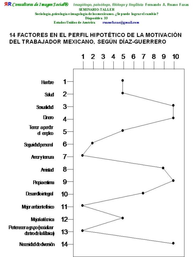 […] Veamos el comportamiento de estos 14 factores en el perfil hipotético de la motivación del trabajador mexicano, según Díaz-Guerrero: