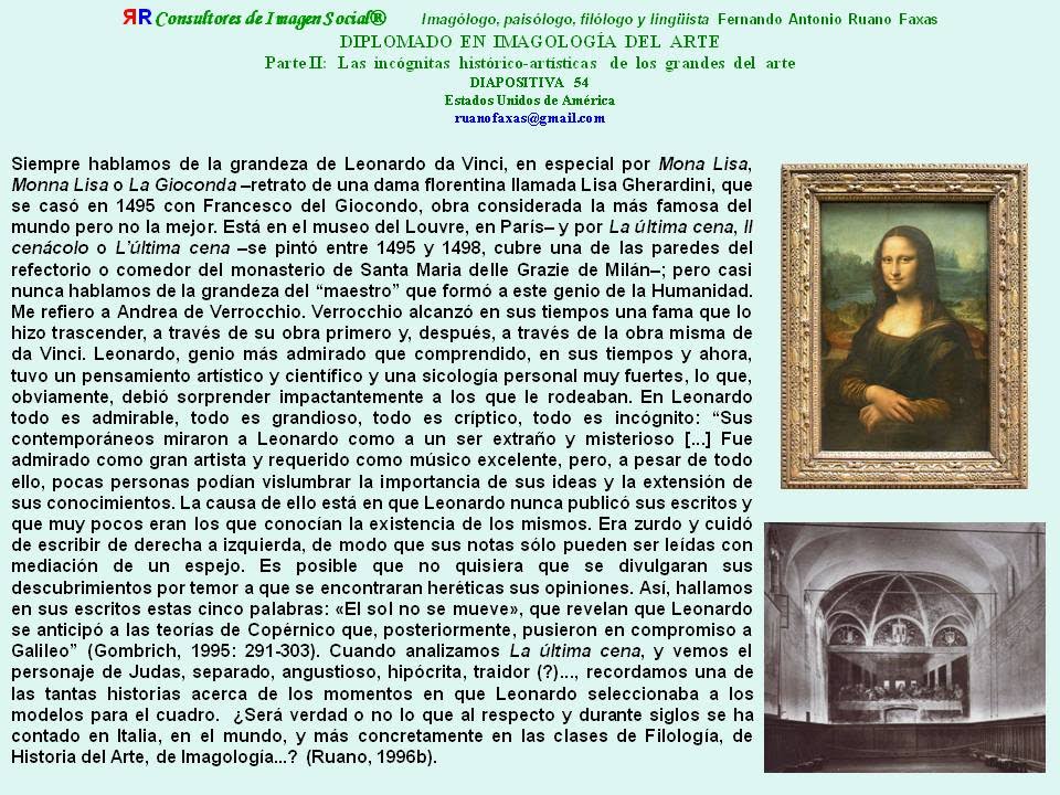 […] Siempre hablamos de la grandeza de Leonardo da Vinci, en especial por Mona Lisa, Monna Lisa o La Gioconda –retrato de una dama florentina llamada Lisa Gherardini, que se casó en 1495 con Francesco del Giocondo, obra considerada la más famosa del mundo pero no la mejor. Está en el museo del Louvre, en París– y por La última cena, Il cenácolo o L’última cena –se pintó entre 1495 y 1498, cubre una de las paredes del refectorio o comedor del monasterio de Santa Maria delle Grazie de Milán–; pero casi nunca hablamos de la grandeza del “maestro” que formó a este genio de la Humanidad. Me refiero a Andrea de Verrocchio. Verrocchio alcanzó en sus tiempos una fama que lo hizo trascender, a través de su obra primero y, después, a través de la obra misma de da Vinci. Leonardo, genio más admirado que comprendido, en sus tiempos y ahora, tuvo un pensamiento artístico y científico y una sicología personal muy fuertes, lo que, obviamente, debió sorprender impactantemente a los que le rodeaban. En Leonardo todo es admirable, todo es grandioso, todo es críptico, todo es incógnito: “Sus contemporáneos miraron a Leonardo como a un ser extraño y misterioso […] Fue admirado como gran artista y requerido como músico excelente, pero, a pesar de todo ello, pocas personas podían vislumbrar la importancia de sus ideas y la extensión de sus conocimientos. La causa de ello está en que Leonardo nunca publicó sus escritos y que muy pocos eran los que conocían la existencia de los mismos. Era zurdo y cuidó de escribir de derecha a izquierda, de modo que sus notas sólo pueden ser leídas con mediación de un espejo. Es posible que no quisiera que se divulgaran sus descubrimientos por temor a que se encontraran heréticas sus opiniones. Así, hallamos en sus escritos estas cinco palabras: «El sol no se mueve», que revelan que Leonardo se anticipó a las teorías de Copérnico que, posteriormente, pusieron en compromiso a Galileo” (Gombrich, 1995: 291-303). Cuando analizamos La última cena, y vemos el personaje de Judas, separado, angustioso, hipócrita, traidor (?)…, recordamos una de las tantas historias acerca de los momentos en que Leonardo seleccionaba a los modelos para el cuadro. ¿Será verdad o no lo que al respecto y durante siglos se ha contado en Italia, en el mundo, y más concretamente en las clases de Filología, de Historia del Arte, de Imagología…? (Ruano, 1996b).