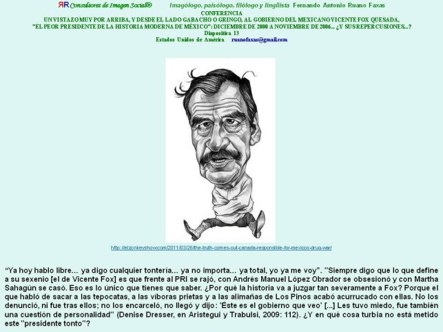 Y por si todas las barbajanadas y los bandolerismos de todo tipo del PRI y sus “ilustrísimos miembros y funcionarios”, del tipo de la “maístra” Elba Esther Gordillo, no hubieran sido suficientes para sentar las bases de todo lo que está pasando en México hoy con el gobierno del PAN y Felipe Calderón […] aparece antes de llegar Calderón, el gobierno de Vicente Fox, que al decir de la inmensa mayoría de los mexicanos y los medios masivos de comunicación ha sido el presidente más estúpido, imbécil, tarado, anormal, babas, mandilón, inculto, analfabeto funcional…, que ha tenido México http://knol.google.com/k/un-vistazo-muy-por-arriba-y-desde-el-lado-gabacho-o-gringo-al-gobierno-del