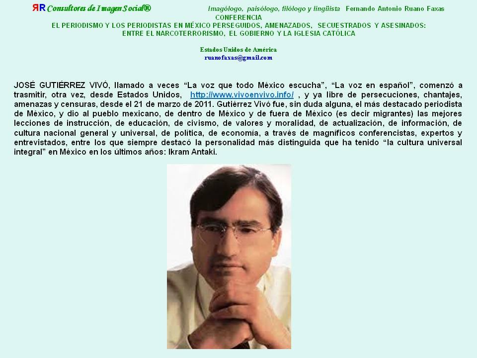 Y por supuesto que todos los politiqueros mexicanos deben estar aterrorizados, porque justamente ahora ya empezó a salir al aire, otra vez, ”el terror de los cuatreros y corruptos políticos mexicanos” […] Me refiero al famoso periodista José Gutiérrez Vivó, que tantos y tantos y tantos dolores de cabeza les sigue dando a los “pandilleros y buenos para nada” de la política mexicana […] Ahora ya no podrán hacerle nada a José Gutiérrez Vivó, ya no podrán amenazarlo, como lo hicieron el idiota e ignorante de Vicente Fox y la naca con ínfulas de su mujer, la pueblerina Martha Sahagún: http://knol.google.com/k/un-vistazo-muy-por-arriba-y-desde-el-lado-gabacho-o-gringo-al-gobierno-del# , http://knol.google.com/k/panorama-de-m%C3%A9xico-en-el-siglo-xxi-los-principales-problemas-de-m%C3%A9xico-parte-i# […] y como también lo ha hecho de cierta manera ese confundido que se denomina presidente de México, que lleva por nombre Felipe Calderón Hinojosa, y que tiene a México metido en un callejón sin salidas: http://knol.google.com/k/la-guerra-perdida-de-m%C3%A9xico-contra-el-narcotr%C3%A1fico-m%C3%A9xico-en-estado-de-colapso […] Gutiérrez Vivó está trasmitiendo ahora desde Estados Unidos: http://www.vivoenvivo.info/ , tierra en donde se refugian todos los perseguidos de este mundo […] Y José Gutiérrez Vivó está presente en el mundo entero, en todo Internet: http://twitter.com/#!/vivoenvivo , http://www.facebook.com/vivoenvivo.info […] el excelente periodista, cultivado hombre de las comunicaciones y la cultura en general, el mexicano José Gutiérrez Vivó: http://es.wikipedia.org/wiki/Jos%C3%A9_Guti%C3%A9rrez_Viv%C3%B3 , un hombre que también fue devorado en México, en América Latina, por el torbellino de la corrupción política, por el huracán de la impunidad mexicana, como otros tantos y tantos y tantos latinoamericanos […] En México es muy común, habitual, la persecución a todo tipo de medio de difusión masiva y a todo tipo de periodista o comunicador. Basta media vez que “alguien de arriba” se sienta mal, se sienta molesto, se sienta aludido, se sienta señalado, se sienta amenazado, se sienta incómodo, con algún medio periodístico o con algún periodista o con alguna opinión, para que las persecuciones y las amenazas se hagan tan constantes para esos medios o esos periodistas que llegue al “borramiento” de ese medio de comunicación o de ese periodista, y hasta con la muerte misma. ¡Y cómo hay incómodos y molestos en México con los periodistas! ¡Esos molestos o incómodos con los medios de comunicación y con los periodistas en México son plagas! Si alguien tiene dudas al respecto, que le pregunte a José Gutiérrez Vivó, a Carmen Aristegui, a Lydia Cacho, a Sanjuana Martínez, a Anabel Hernández, entre muchos otros periodistas, comunicadores, escritores mexicanos “que afortunadamente siguen vivos”: http://knol.google.com/k/fernando-antonio-ruano-faxas/el-periodismo-y-los-periodistas-en/19j6x763f3uf8/147 , http://knol.google.com/k/fernando-antonio-ruano-faxas/panorama-de-la-incidencia-del/19j6x763f3uf8/135 […] En México, entre el 2000 y el 2010, se han registrado 67 periodistas asesinados y 12 desaparecidos. ¿Quién conoce en este país “realmente” estos datos? ¡Nadie! ¡Poquísimos! Y los que saben bien las historias, callan, por miedo o complicidad […]