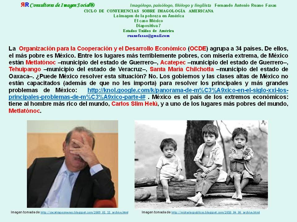 […] “Este país es extraño: las mismas leyes de la naturaleza parecen estar revertidas […] Los mexicanos no son pobres. Con una tierra como ésta, nadie es pobre. Su particularidad ha sido inventar la injusticia antes que la pobreza […]” (Antaki, 1996). Nuestro amado México siempre aparece, “para variar”, como líder de la pobreza o entre los más pobres de América y del mundo entero. Al respecto véase: “Estudio de la CEPAL ubica a México como líder en pobreza”: http://www.telesurtv.net/noticias/secciones/nota/62142-NN/estudio-de-la-cepal-ubica-a-mexico-como-lider-en-pobreza/ , http://www.eluniversal.com.mx/primera/33960.html , http://www.elimparcial.com/EdicionEnLinea/Notas/Nacional/20112009/415121.aspx , http://eleconomista.com.mx/notas-impreso/internacional/2009/11/19/mas-pobres-herencia-crisis-cepal . Y también “para variar” México es líder en fraudes, en corrupciones de todo tipo: http://www.jornada.unam.mx/2009/11/20/index.php?section=economia&article=025n2eco , http://web.zocalo.com.mx/seccion/articulo/es-mexico-un-pais-de-fraudes , http://www.cnnexpansion.com/mi-dinero/2009/11/19/mexico-con-mas-fraudes-por-la-crisis , http://www.eluniversal.com.mx/notas/641105.html […] México está plagado de corrupción, en todos los lugares, es un terrible cáncer, es una terrible epidemia, muy contagiosa, y en este país la gran corrupción empieza con los políticos y los jerarcas del Catolicismo […] Libro Los ricos del gobierno. La costumbre de la corrupción, de Luis Pazos […] http://blogs.cnnmexico.com/aristegui/2012/02/20/los-ricos-del-poder/