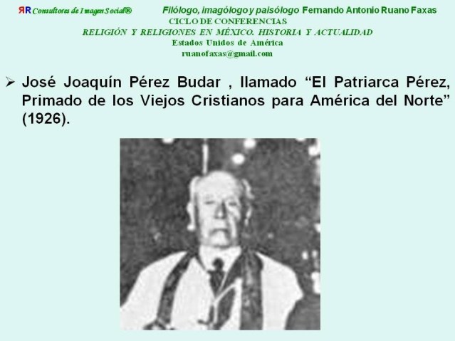 [3] Para considerar el “cisma mexicano”, véase, entre otros materiales: Arnulfo P. Hurtado (1956). El cisma mexicano. México, Buena Prensa y Mario Ramírez Rancaño (2006). El patriarca Pérez. La Iglesia católica apostólica mexicana. México, UNAM-Instituto de Investigaciones Sociales, y José Joaquín Pérez Budar en http://nl.wikipedia.org/wiki/Jos%C3%A9_Joaqu%C3%ADn_P%C3%A9rez_Budar . En 1926, mientras regía como papa en el Vaticano Pío XI –italiano de nacimiento, cuyo nombre era Archille Ratti, que fue papa entre 1922 y 1939–, el general y presidente mexicano Plutarco Elías Calles nombró “Patriarca” al cura oaxaqueño José Joaquín Pérez Budar, luego de un conflicto que se produjo en el seno de la Iglesia católica Mexicana a partir de febrero de 1925: “En octubre de 1926, el Patriarca Pérez fue consagrado Primado de los Viejos Cristianos para América del Norte” (Álvarez, 1987, t. XI: 6307-6308).