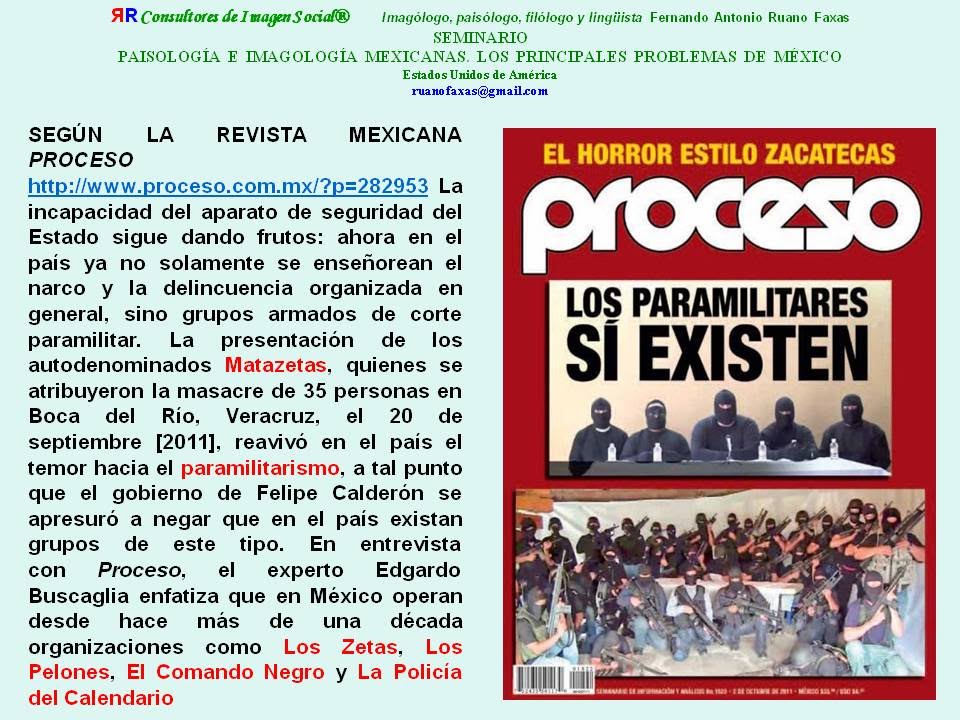 Para considerar más ampliamente los problemas relacionados con la inseguridad y la peligrosidad en México, puede consultarse, por ejemplo: Percepción ciudadana sobre la seguridad en México, 2007, en http://www.consulta.com.mx/interiores/99_pdfs/15_otros_pdf/oe_PRESENTACONFERENCIAPRENSAMITOFSKY22AGO07.pdf y “Armas sin fronteras”, en Reporte Índigo, No. 88, del 27 de junio al 3 de julio de 2008, en http://www.reporteindigo.com/web/edicion88/reporte/ . Existe en este país una página o WEB o sitio de Internet, llamado No te calles. De ciudadano a ciudadano, con dirección http://www.notecalles.org.mx/ , dirigido por el Instituto Ciudadano de Estudios sobre la Inseguridad (ICESI), y que busca que cualquier ciudadano pueda denunciar todo tipo de acto delictivo.