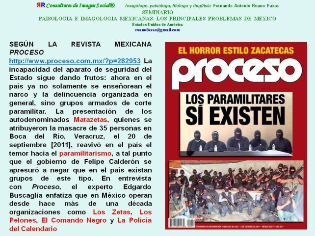 La inseguridad en México se relaciona con historias inconcebibles, increíbles, inclusive para los que hemos vivido directamente, de cerca, los efectos de las dictaduras militares más antiguas, duraderas, comentadas, y en algunos casos altamente sangrientas, a nivel internacional, inclusive para nosotros, los historiadores, filólogos e investigadores de la evolución de las religiones, de la edad media, de la Inquisición y de todas las atrocidades cometidas en la historia de la Humanidad… Para tratar este tema en México, consúltense, por ejemplo, las publicaciones de Héctor Aguilar Camín, en tres partes, que llevan por nombre Acteal, en la revista mexicana Nexos, en, por ejemplo, http://nexos.com.mx/articulos.php?id_article=1510&id_rubrique=664 . Obviamente, consúltense aquí las notas, los comentarios y la bibliografía que aporta el autor. En México, el país considerado como el más católico del mundo, ni los sacerdotes se libran del secuestro, como nos recuerda el caso del sacerdote michoacano jesuita Wilfredo Guinea, de 74 años, secuestrado en 1997, por el que se pagó la cantidad de 2.5 millones de pesos mexicanos; pero infructuosamente: fue asesinado. ¡Terrible el asunto! Los homicidios tumultuarios o mulltihomicidios, inclusive con decapitación, con decapitados, ya son habituales en México. Al respecto puede verse, entre cientos de informaciones: http://www.meborre.com/videos-de-los-11-cuerpos-decapitados-en-mexico-yucatan-18/ , http://news.bbc.co.uk/hi/spanish/latin_america/newsid_7587000/7587281.stm , http://ecodiario.eleconomista.es/mundo/noticias/714075/08/08/Seis-policias-y-cuatro-civiles-asesinados-en-la-ultima-jornada-en-Mexico.html , http://www.jornada.unam.mx/2008/09/15/index.php?section=politica&article=003n1pol , http://noticias.prodigy.msn.com/Landing.aspx?cp-documentid=10281704 , http://www.elporvenir.com.mx/notas.asp?nota_id=203918 , http://www2.esmas.com/noticierostelevisa/mexico/008040/aclaran-multihomicidio-bufete-juridico-guadalajara , http://www.proceso.com.mx/impreso.php . Otra tétrica y degradante historia de crímenes en México está relacionada con “El Pozolero”, es decir Santiago Meza López, también llamado “El Chago” o “El Chaguito”. Al respecto puede consultarse: http://www.eluniversal.com.mx/notas/571866.html , http://www.milenio.com/node/154528 , http://www.jornada.unam.mx/2009/01/26/index.php?section=politica&article=012n1pol , etc.