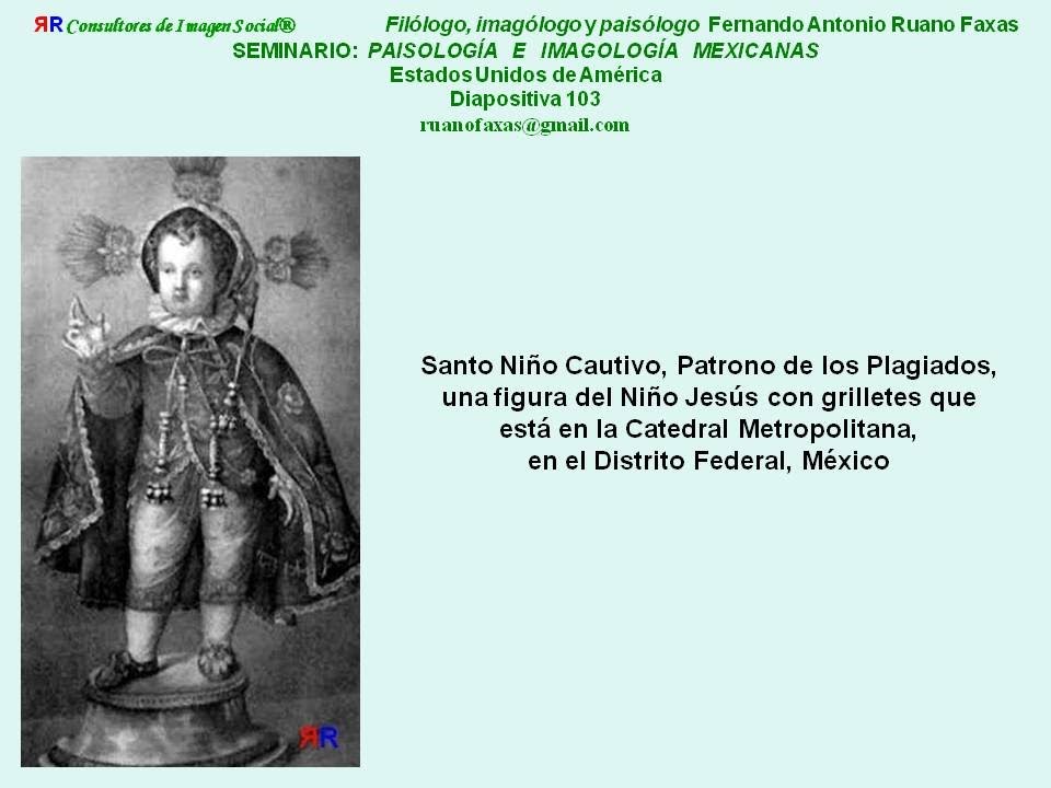 ¿Cuál es la historia de esta figura con grilletes en las manos [es decir la del Santo Niño Cautivo, Patrono de los Plagiados o Secuestrados]? Es una figura de madera del niño Jesús, de unos 50 centímetros de altura, realizada en España en el siglo XVII por el tallador sevillano Juan Martínez Montañez. La hechura fue solicitada por el canónigo mexicano Francisco Sandoval Zapata, quien pretendía obsequiarla a la Catedral. Cuando estuvo lista, el hombre fue a buscarla a España —en 1622— y, al volver por mar, fue secuestrado por piratas moros y llevado a Argel. El cautiverio duró siete años a lo largo de los cuales la figura no fue embodegada, sino que permaneció al lado de Sandoval. Luego de que al fin fue pagado el rescate, Sandoval falleció durante el viaje de regreso a México. La figura arribó a la Catedral con los restos del hombre. Al niño se le colocaron unos pequeños grilletes de plata y desde entonces se invoca su ayuda para conseguir la libertad física y espiritual de las personas. En un principio se le rezaba para que los niños mudos hablaran, para que curara a drogadictos y alcohólicos de su enfermedad, y para que los encarcelados fueran liberados. Con el auge del delito del secuestro, el Niño Cautivo ha sido adoptado por mexicanos que sufren el plagio de sus familiares.