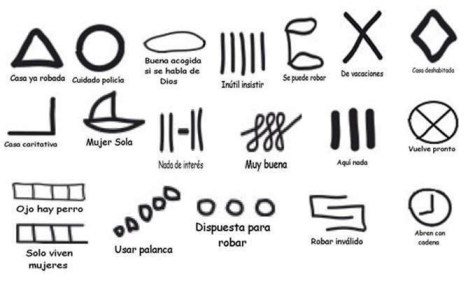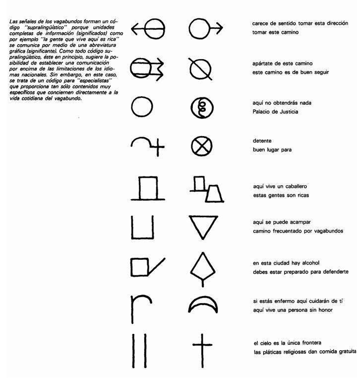 Cuando hablamos de “signos lógicos” o “códigos lógicos” o “señales lógicas” o “señas lógicas” o “gestos lógicos”, etc., en la comunicación humana, tenemos que recordar que “la lógica” y “lo lógico” se consideran a partir de toda una serie de circunstancias socio-comunicativas, socio-lingüísticas, contextuales y espacio-temporales concretas de los grupos de usuarios de los signos, de los códigos, de las palabras, de las señales, de las señas, de los gestos, de los ademanes, etc…. De tal manera, así como una palabra puede tener muchos significados según los dialectos sociales, geográficos y profesionales, “según los contextos”, también los signos, los dibujos, las señales, los gestos, etc., tendrán muchos significados según sean los grupos de usuarios y sus contextos particulares. Veamos a continuación algunos signos empleados por delincuentes y por vagabundos y sus significados: