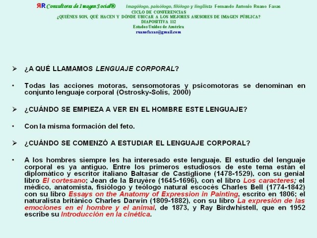 […] El estudio de la comunicación no verbal en su variante del lenguaje corporal, es decir la imagología corporal, es ya antiguo. Entre los primeros investigadores de este tema están el diplomático y escritor italiano Baltasar de Castiglione (1478-1529), con su genial libro El cortesano; el escritor y moralista francés Jean de la Bruyère (1645-1696), con el libro Los caracteres; el médico, anatomista, fisiólogo y teólogo natural escocés Charles Bell (1774-1842) con su libro Essays on the Anatomy of Expression in Painting, escrito en 1806; el naturalista británico Charles Darwin (1809-1882), con su libro La expresión de las emociones en el hombre y el animal, en 1873, y el antropólogo estadounidense Ray L. Birdwhistell, que en 1952 escribe su Introducción en la cinética y en 1970 Kinesics and Context. Essays on Body Motion Communication, que en lengua española se conoce como El lenguaje de la expresión corporal, a partir de una edición que en 1979 hizo la editorial Gustavo Gili […] El primer país de la América conquistada por Europa, y también uno de los primeros del mundo, que reflexiona en torno a las “buenas maneras de hablar” y las “buenas maneras de comportarse” considerando la cultura occidental, casi al mismo tiempo, algo así como si al juntar estas dos partes aparecieran las raíces de la sociolingüística en nuestro Continente, considerando las particularidades del entonces –lo que todavía tiene, después de siglo y medio, mucha vigencia–, fue Venezuela. En 1847, aparece la obra más célebre que se ha escrito en América acerca del buen uso del idioma español en este continente: Gramática de la lengua castellana destinada al uso de los americanos, del filólogo y jurista venezolano radicado en Chile Andrés Bello [Caracas, Venezuela, 1781-Santiago de Chile, 1865], y, en 1853, aparece el sensacional Manual de urbanidad y buenas maneras, del músico y pedagogo venezolano Manuel Antonio Carreño [Caracas, Venezuela, 1812-París, Francia, 1874] […]