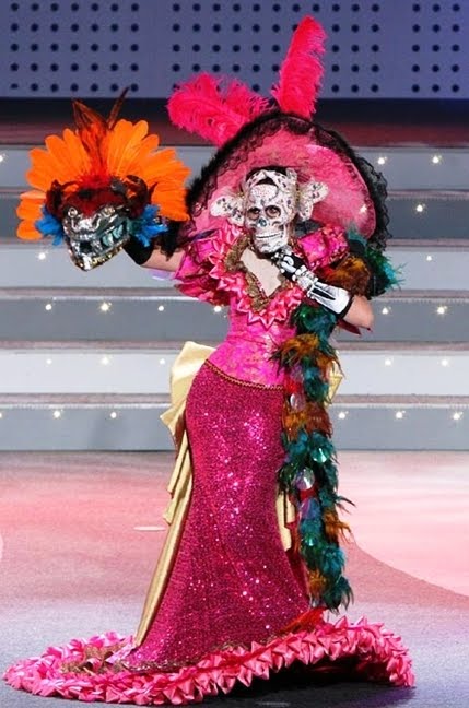[…] ¿Y quién no conoce a la CATRINA o LA CALAVERA GARBANCERA en el mundo? […] Hasta en los concursos de MISS UNIVERSO aparece […] Aquí vemos a la bellísima mexicana Karin Ontiveros mostrando el TRAJE TÍPICO “CATRINA O LA CALAVERA GARBANCERA” en MISS UNIVERSO 2011, ganador del segundo lugar, con un diseño de Jesús Fernando López […]