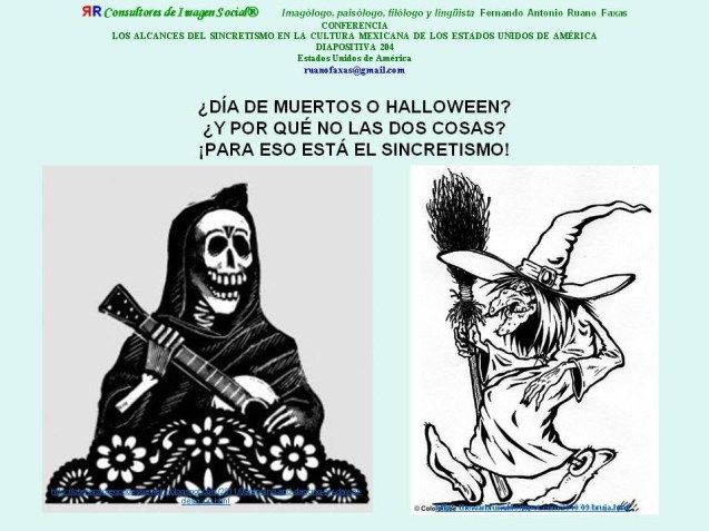 […] ¡Pero cómo no festejar a los muertos en México! […] Con tantos cultos alternativos, cultos relacionados, cultos sincréticos o variantes sectarias y socioconfesionales, con tanto mestizaje religioso, con tanto sincretismo, a lo largo de todo México y a través de toda la historia mexicana, como ha sucedido en toda América, en el mundo entero […] ¿cómo no se iba a festejar los ciclos de vida-muerte, muerte-vida? […] ¡Si hasta los migrantes mexicanos, legales o ilegales, se llevan al mundo entero, y sobre todo a Estados Unidos, su “morral del sincretismo mexicano” http://www.youtube.com/watch?v=L4YJiVZUMT4 , http://www.youtube.com/watch?v=wIzhW-agdN8 , http://www.youtube.com/watch?v=g2F2tkbBVd0 , http://www.youtube.com/watch?v=YNetQKtgXQA&feature=related , http://www.youtube.com/watch?v=O2edkdz_IX4 […] http://www.youtube.com/watch?v=PhvpoM4rNoo&feature=related , http://www.youtube.com/watch?v=Xh9Cp4rd7mI&feature=player_embedded , http://www.youtube.com/watch?v=0CKMaRwicSg&feature=related , http://www.youtube.com/watch?v=ZpqoO7LkgF0&feature=related […] Y el sincretismo mexicano sigue produciéndose, por supuesto, inclusive fuera de México, y no solamente en el aspecto religioso. Ahí está el caso de la gastronomía mexicana en el extranjero, aquí en Estados Unidos http://knol.google.com/k/comida-mexicana-o-gastronom%C3%ADa-mexicana# […] ¿Cuántos mexicanos religiosamente sincréticos, del culto guadalupano, “diz que católicos de pura cepa”, se convierten al protestantismo en cuanto llegan a Estados Unidos? […] “¡A LO QUE TE TRUJE, CHENCHA!” […] ¿Qué pasa con estos “matrimonios mixtos” de mexicanos “católicos” (?) con personas de otras religiones, sobre todo “protestantes”? […] Veamos las cifras […]