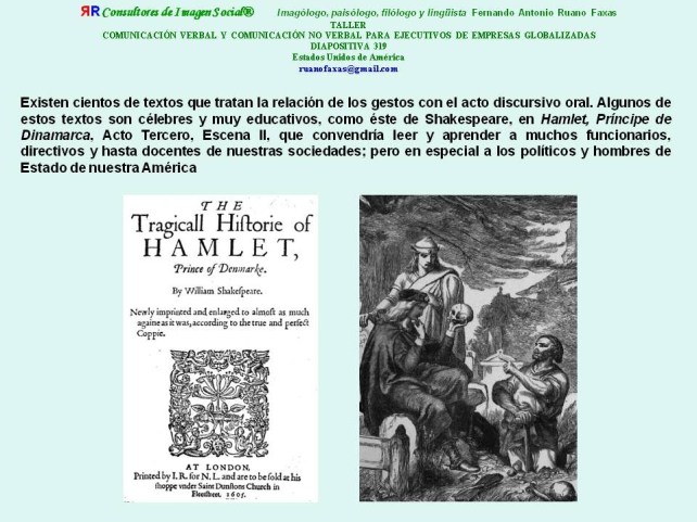 […] Existen cientos de textos que tratan la relación de los gestos con el acto discursivo oral. Algunos de estos textos son célebres y muy educativos, como éste de Shakespeare, en Hamlet, Príncipe de Dinamarca, Acto Tercero, Escena II, que convendría leer y aprender a muchos funcionarios, directivos y hasta docentes de nuestras sociedades; pero en especial a los políticos y hombres de Estado de nuestra América Cualquier análisis de los textos gestuales, de la gestualidad, nos permite distinguir entre una gestualidad significante, es decir la gestualidad que claramente está informando algo, que está comunicando algo, tanto a los demás como al propio emisor de la gestualidad, y la gestualidad insignificante o gestualidad desprovista de sentido, es decir la gestualidad que se produce generalmente de manera inconsciente y que no dice nada lógico o comunicativamente relevante, tanto para los demás como para el mismo emisor de la gestualidad, a menos que se sea un especialista en la decodificación de determinados textos gestuales insignificantes para la masa, para la mayoría, pero significante para un especialista o decodificador especializado en ciertos lenguajes verbo-corporales. Tenemos que partir del hecho de que en situaciones de globalización, internacionalización, mundialización, cualquiera que sea ésta, forzada o no, laboral o especializada o no, la gestualidad se presenta en su modalidad de gestualidad polimórfica, es decir que se puede hacer el mismo gesto para designar o significar cosas diferentes y que se puede hacer gestos idénticos o semejantes para designar una misma cosa […]